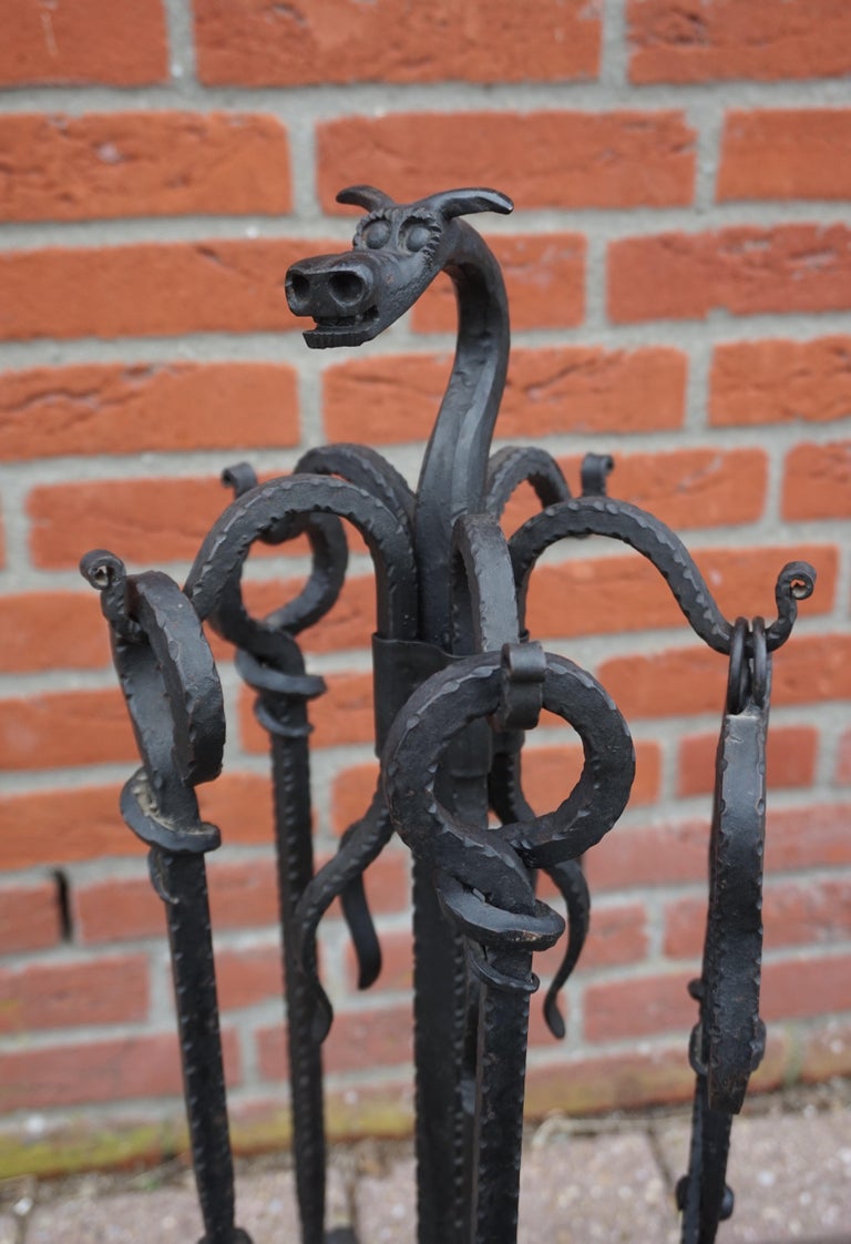 Antique Gothic Style Hand Forged Wrought Iron Dragon Head Fireplace Tools Set At 1stdibs Gothic Fireplace Tools Dragon Fireplace Tools Gothic Tools